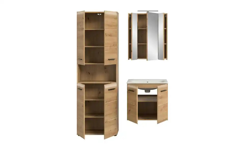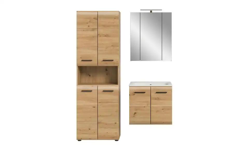 - Bestehend aus1x Hochschrank breit, 1x Waschtisch inkl. Waschbecken, 1x Spiegelschrank inkl. Beleuchtung