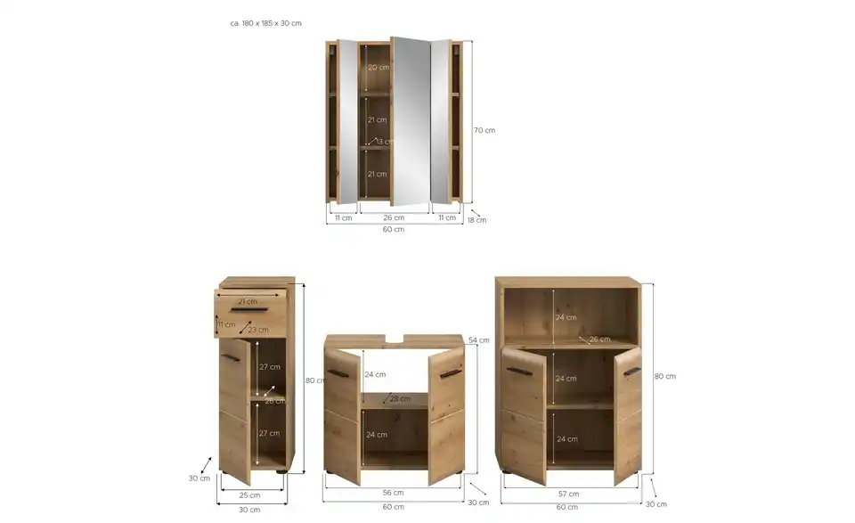 - Bestehend aus1x Standschrank, 1x WBU, 1x Spiegelschrank, 1x Standschrank breit