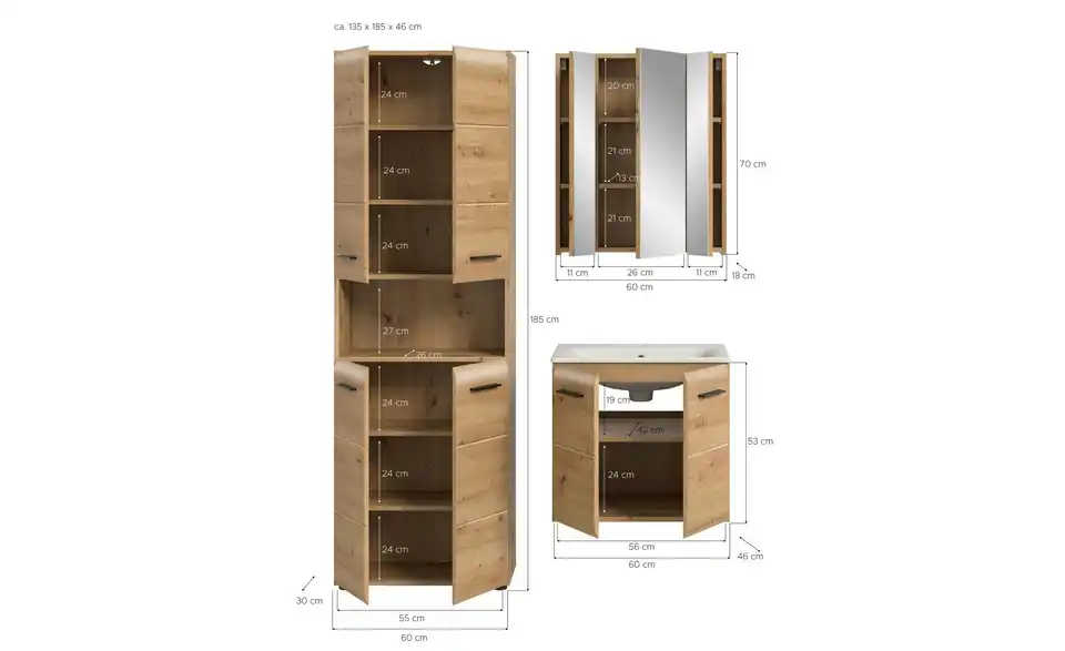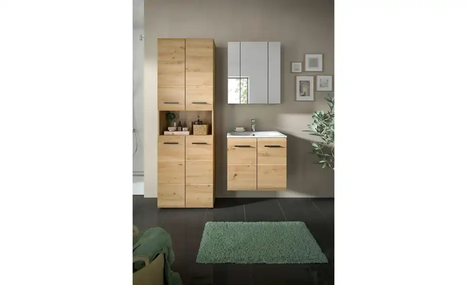 - Bestehend aus1x Hochschrank breit, 1x Waschtisch inkl. Waschbecken, 1x Spiegelschrank