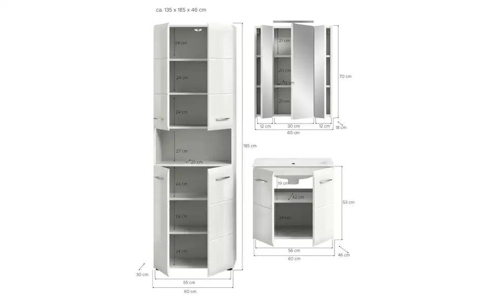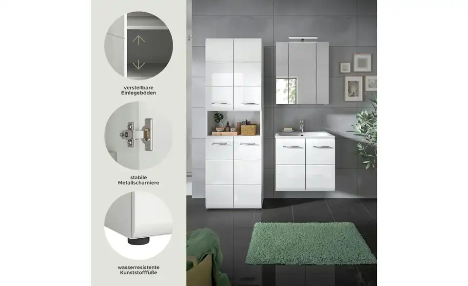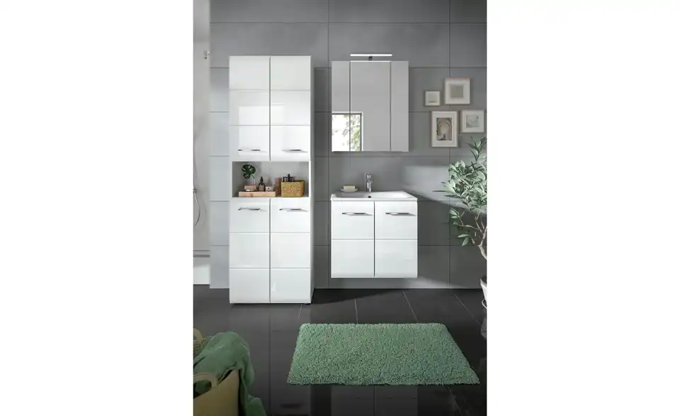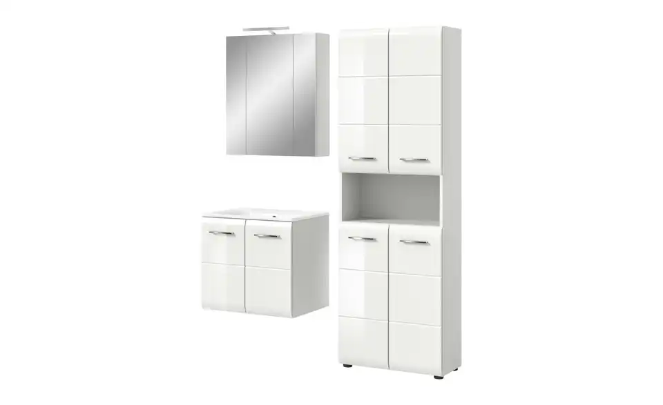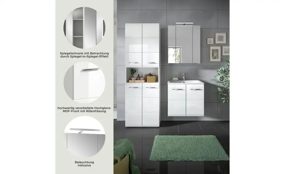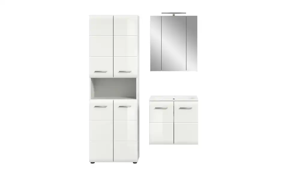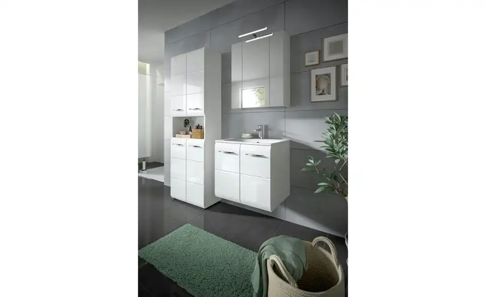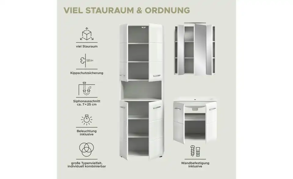 - Bestehend aus1x Hochschrank breit, 1x Waschtisch inkl. Waschbecken, 1x Spiegelschrank inkl. Beleuchtung