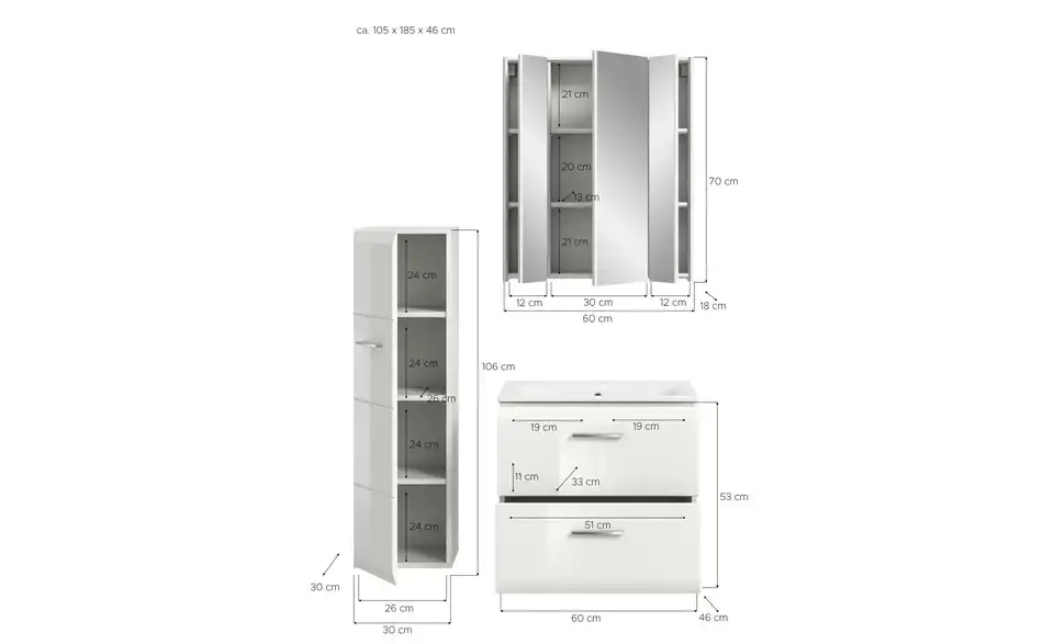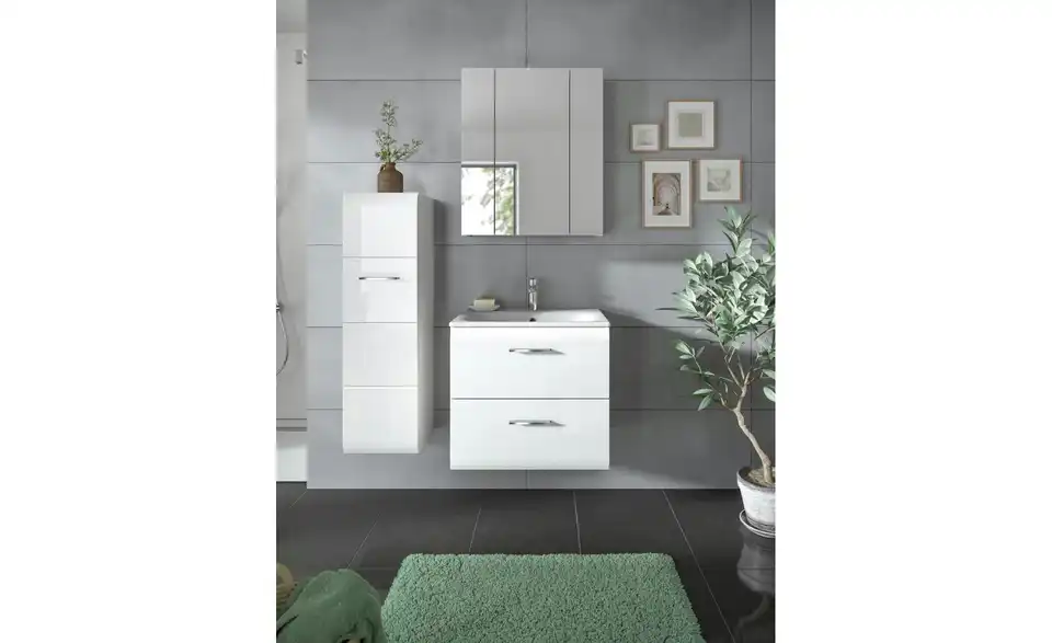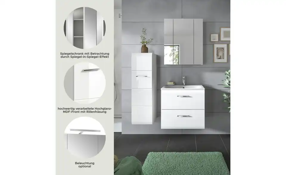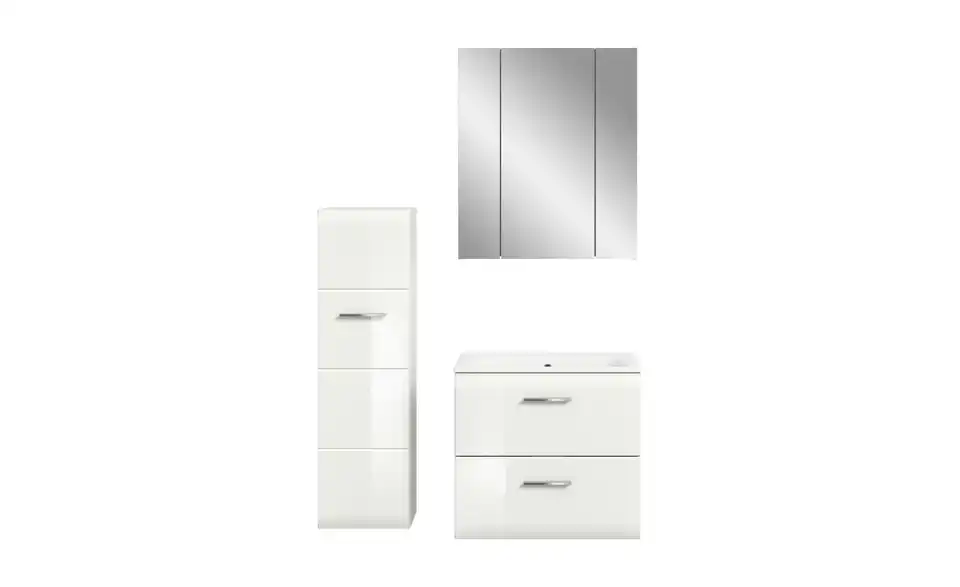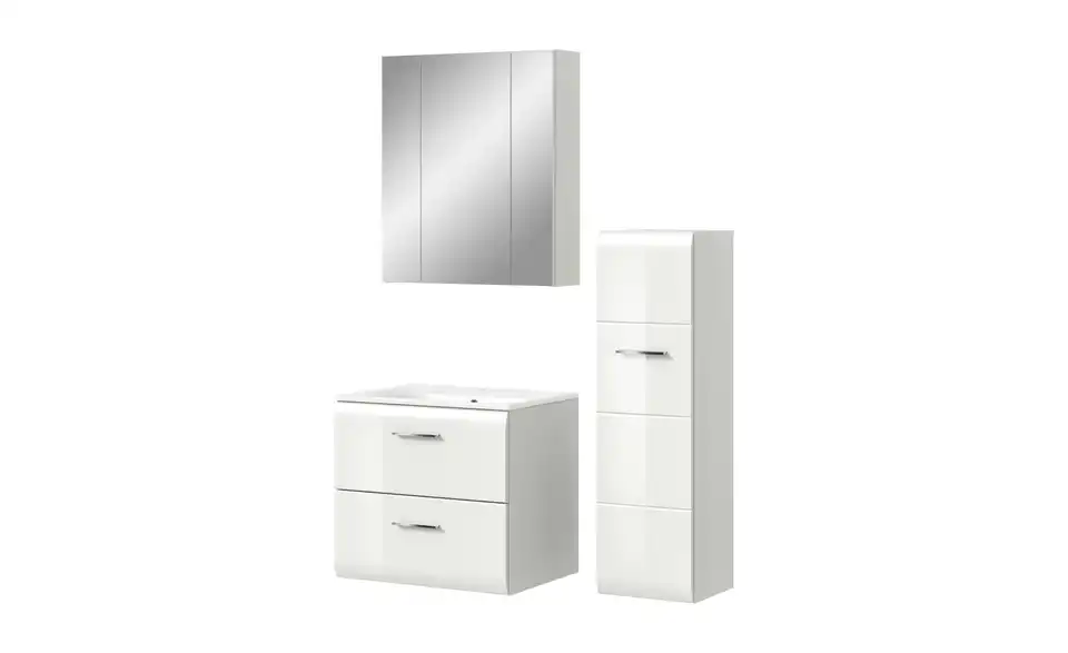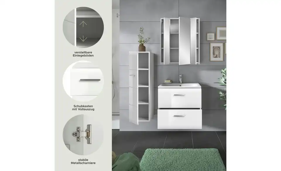 - Bestehend aus1x Stauraumtype, 1x Waschtisch inkl. Waschbecken, 1x Spiegelschrank