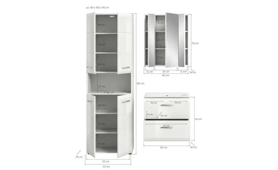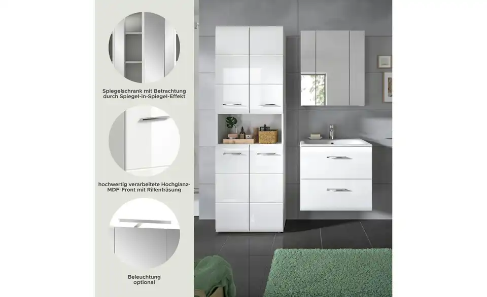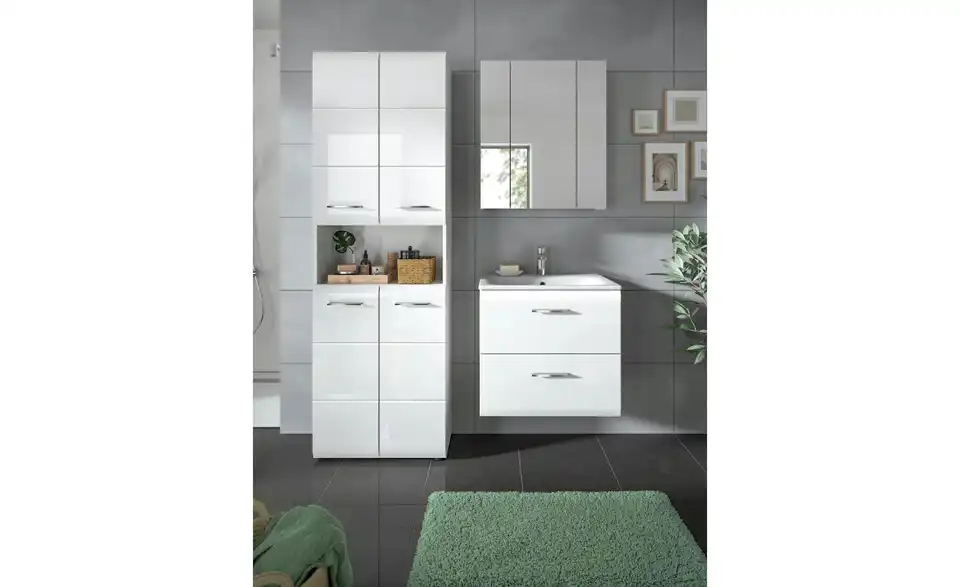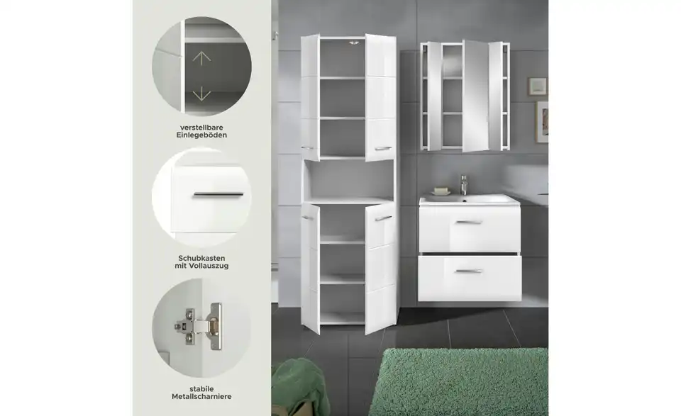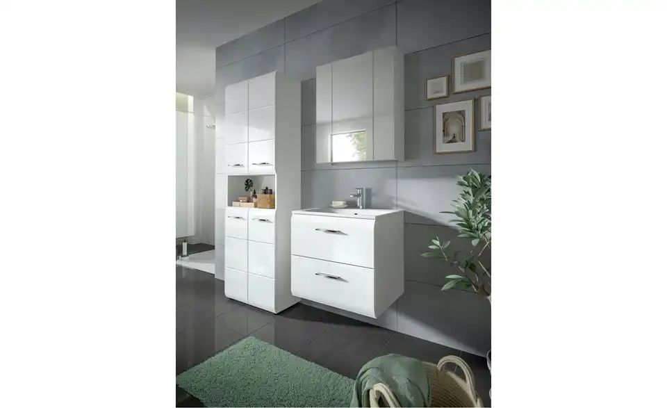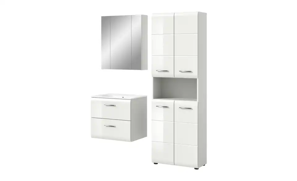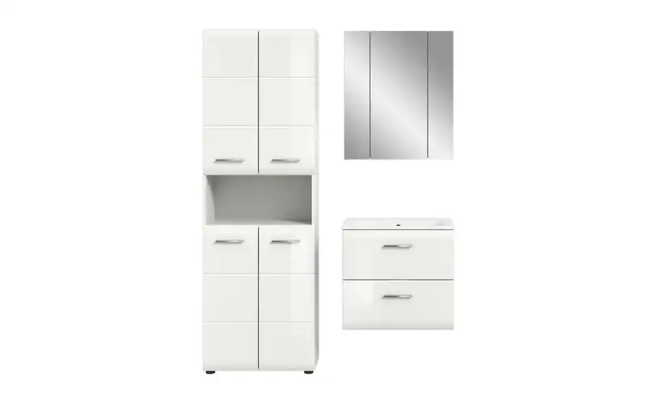 - Bestehend aus1x Hochschrank breit, 1x Waschtisch inkl. Waschbecken, 1x Spiegelschrank