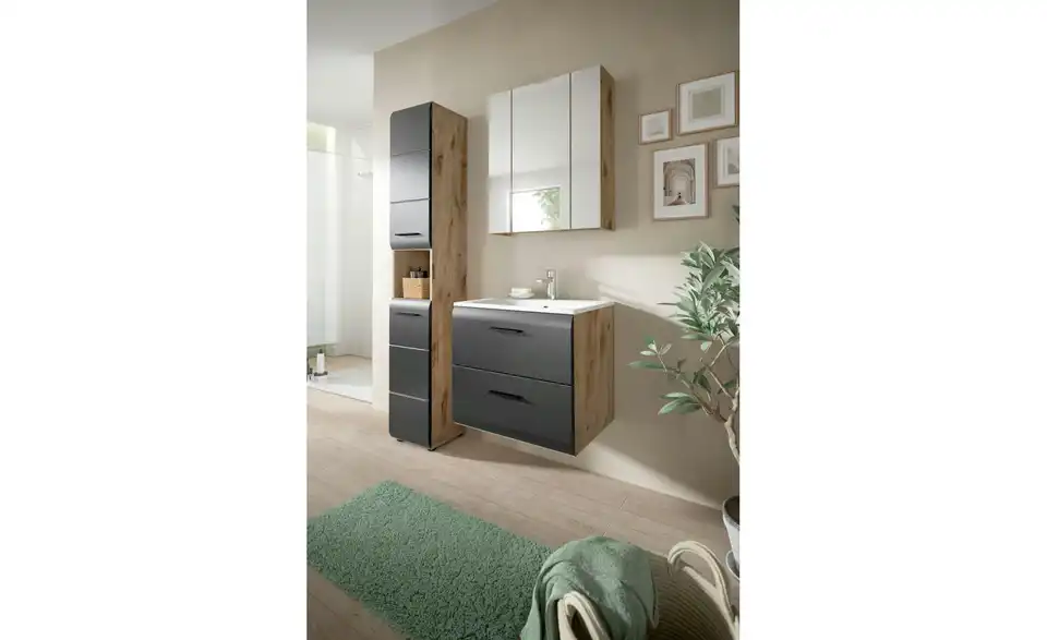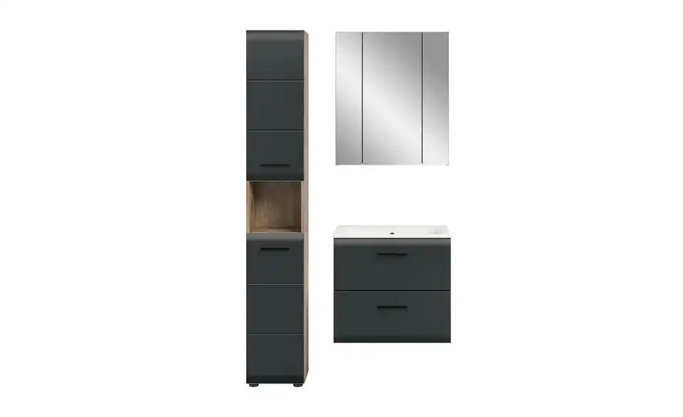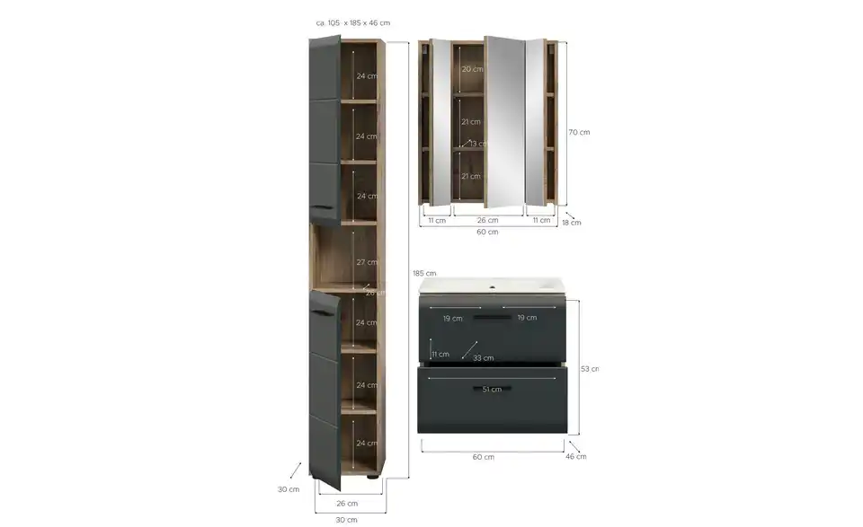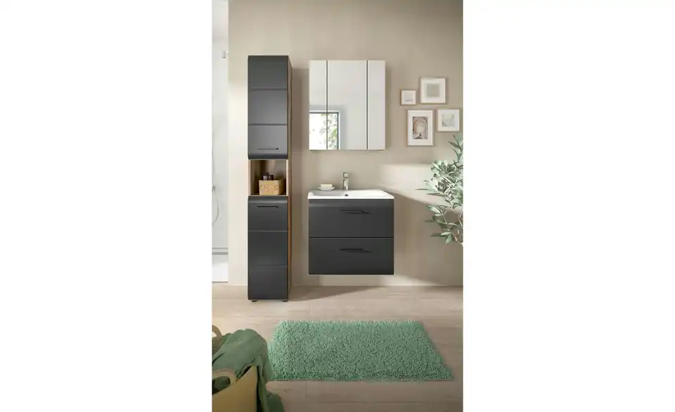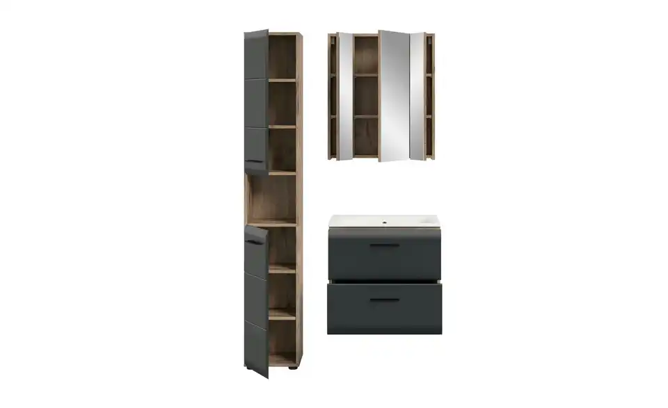 - Bestehend aus1x Hochschrank, 1x Waschtisch inkl. Waschbecken, 1x Spiegelschrank
