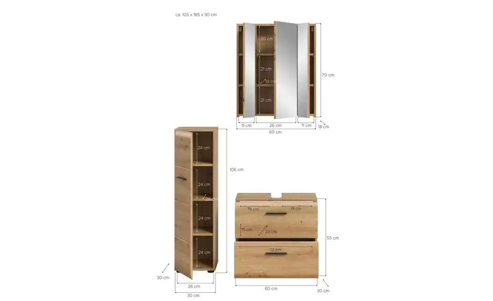 - Bestehend aus1x Stauraumtype, 1x WBU, 1x Spiegelschrank
