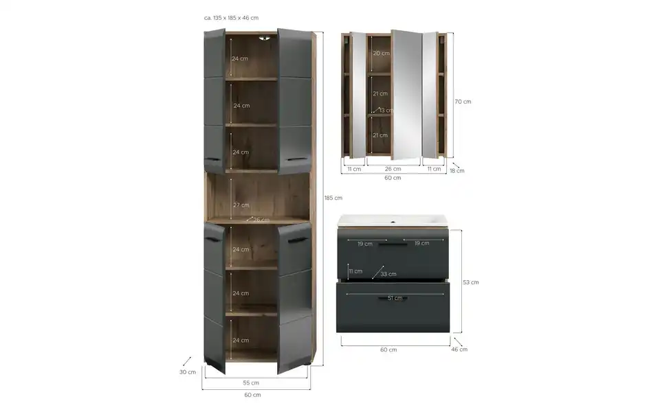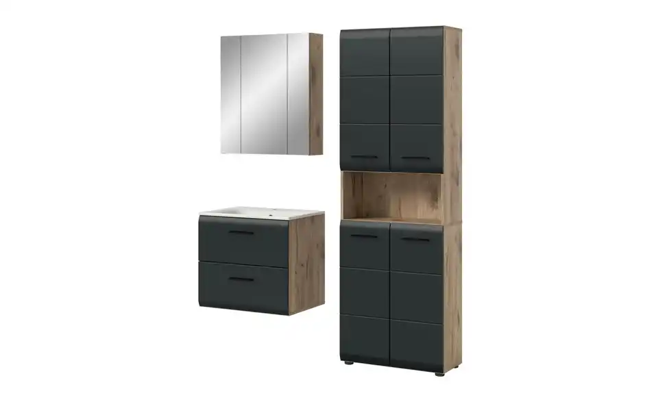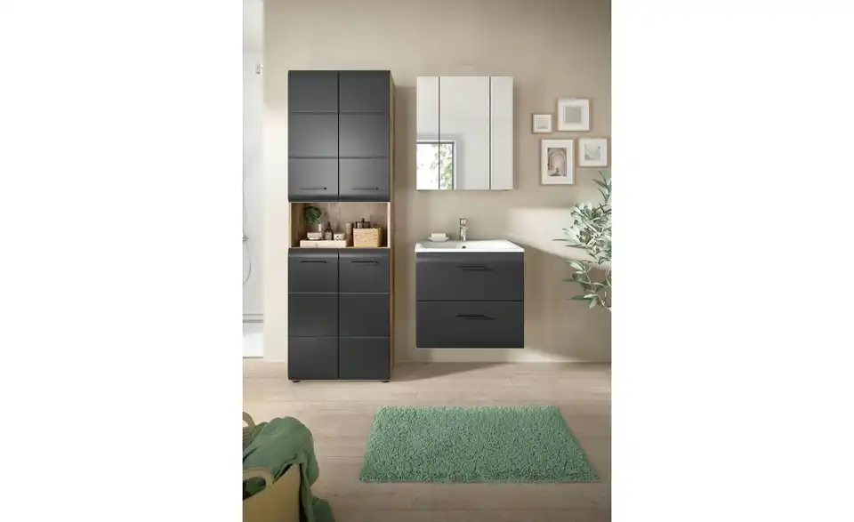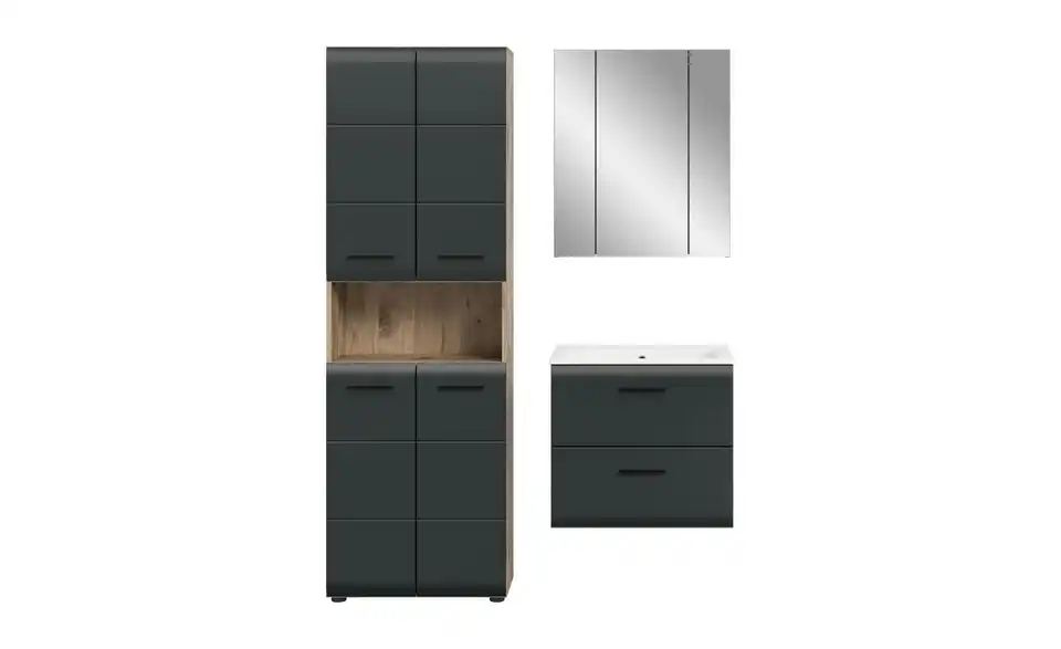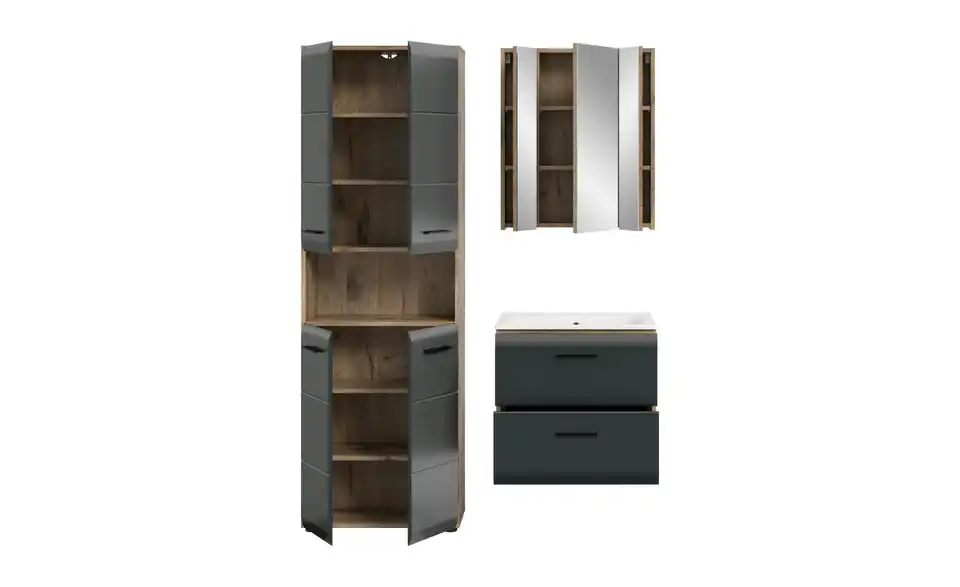 - Bestehend aus1x Hochschrank breit, 1x Waschtisch inkl. Waschbecken, 1x Spiegelschrank