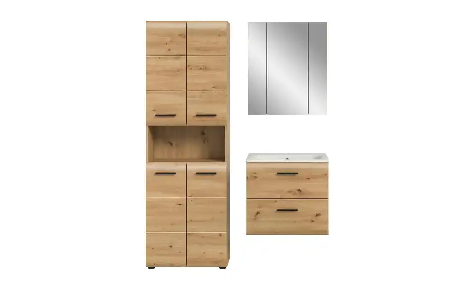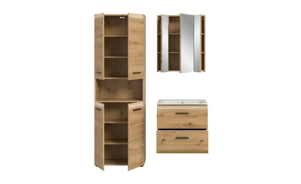 - Bestehend aus1x Hochschrank breit, 1x Waschtisch inkl. Waschbecken, 1x Spiegelschrank