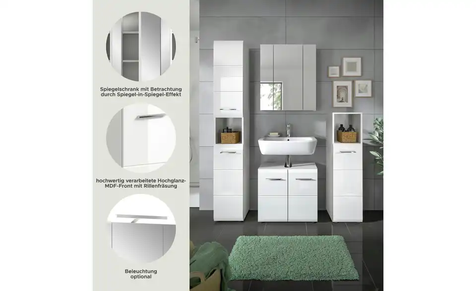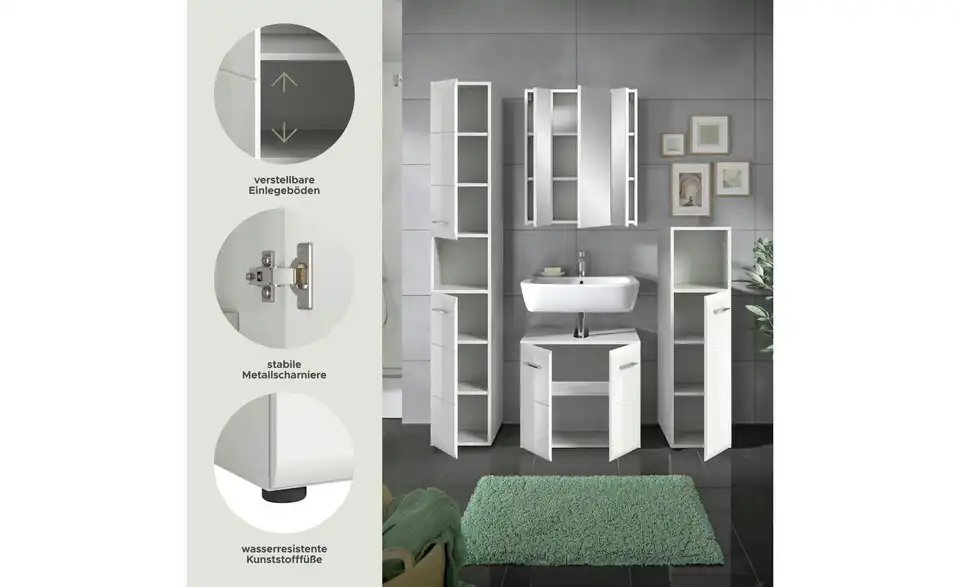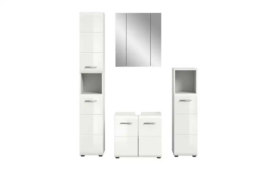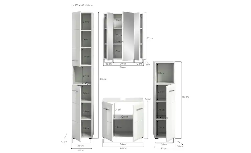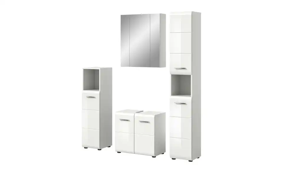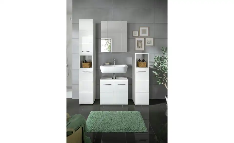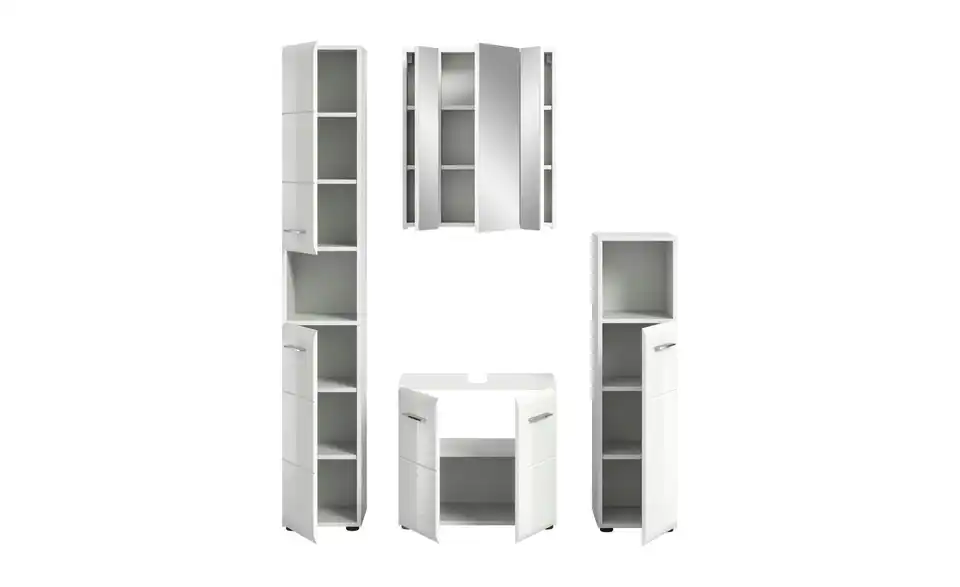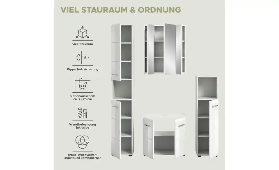 - Bestehend aus1x Hochschrank, 1x WBU, 1x Spiegelschrank, 1x Standschrank hoch