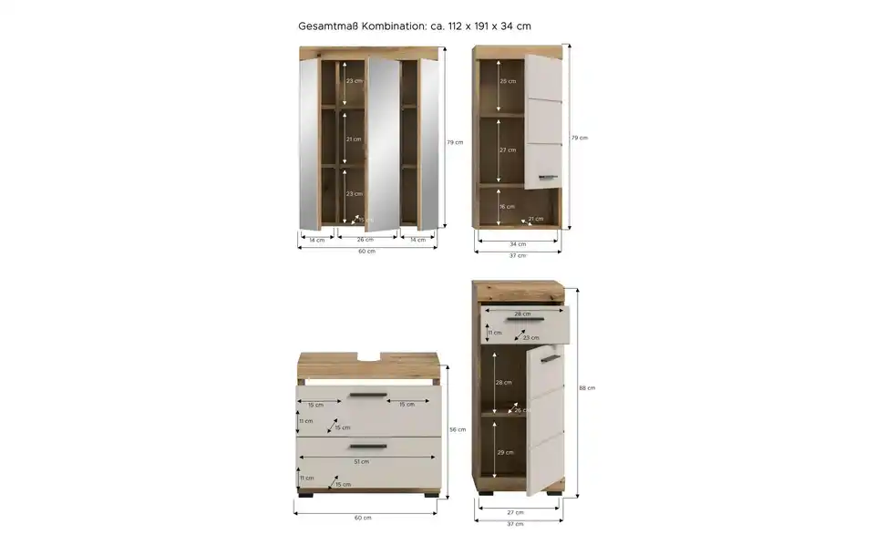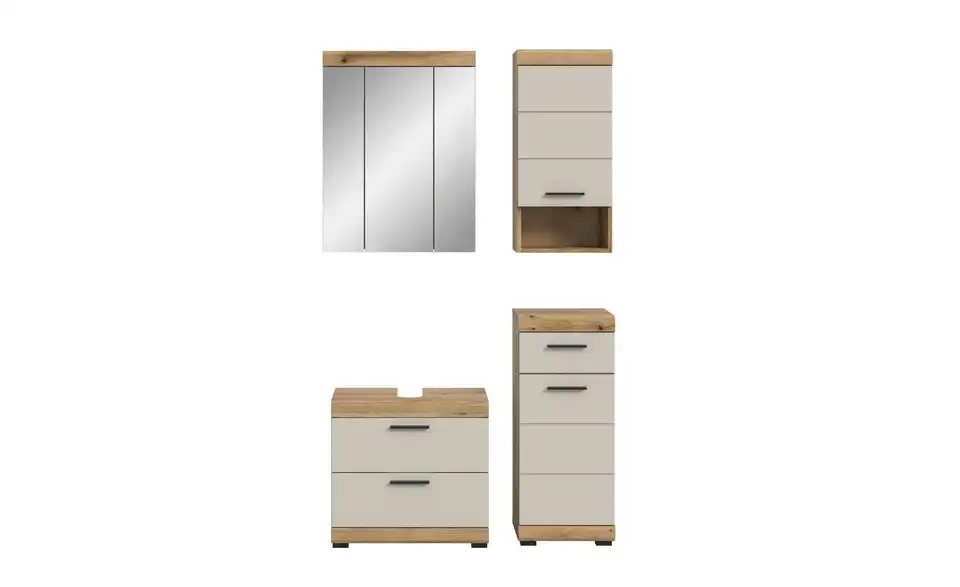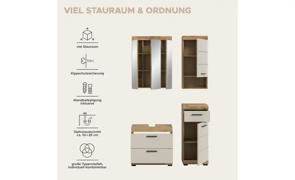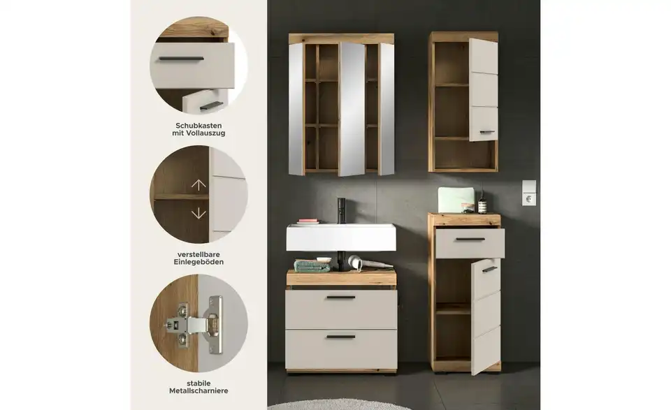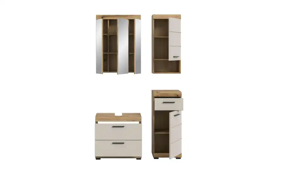- Bestehend aus1x Waschbeckenunterschrank, 1x Spiegelschrank, 1x Standschrank, 1x Hängeschrank