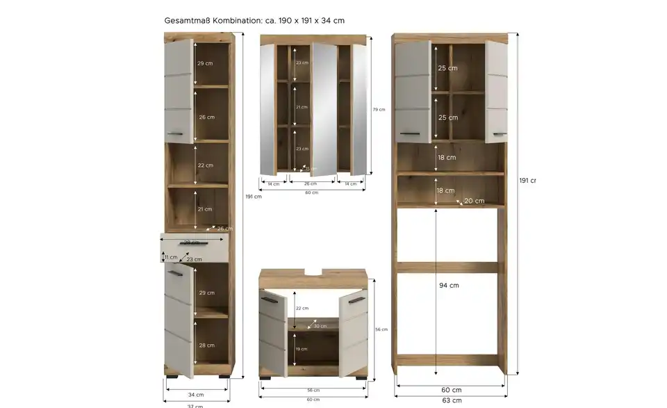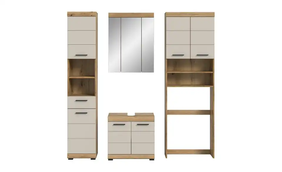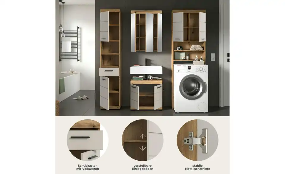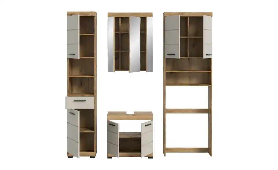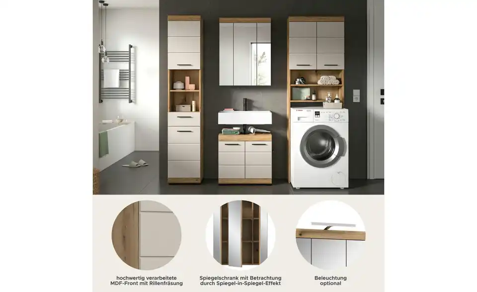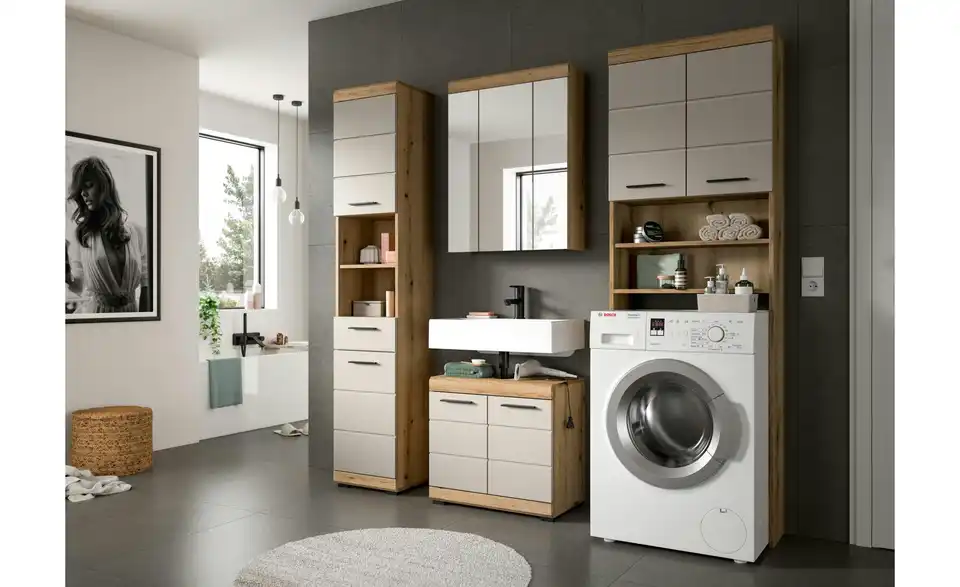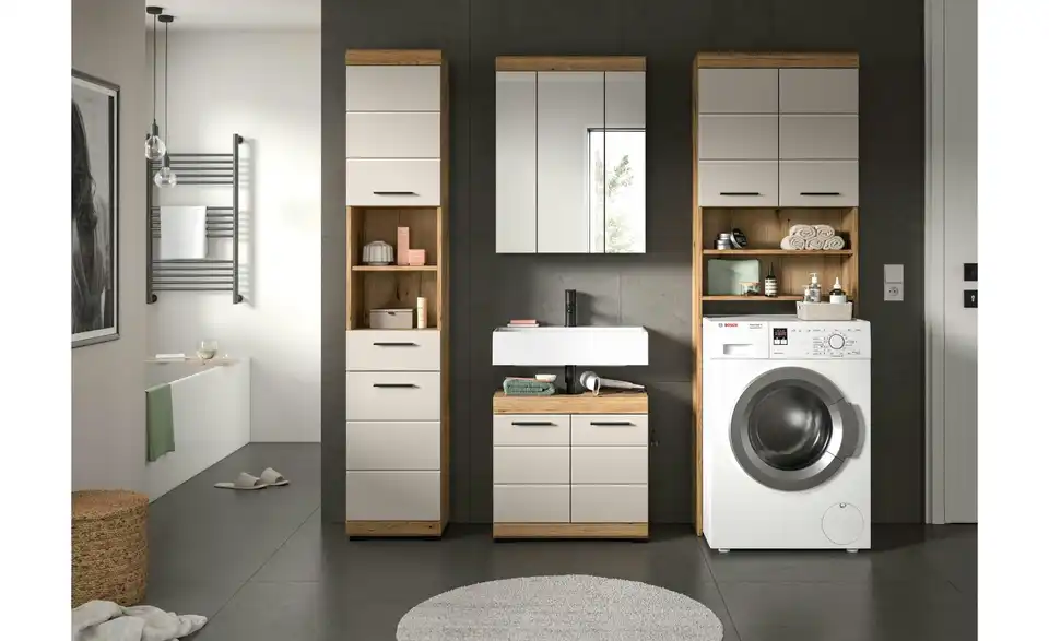 - Bestehend aus1x Hochschrank, 1x Waschbeckenunterschrank, 1x Spiegelschrank, 1x Waschmaschienenüberbau