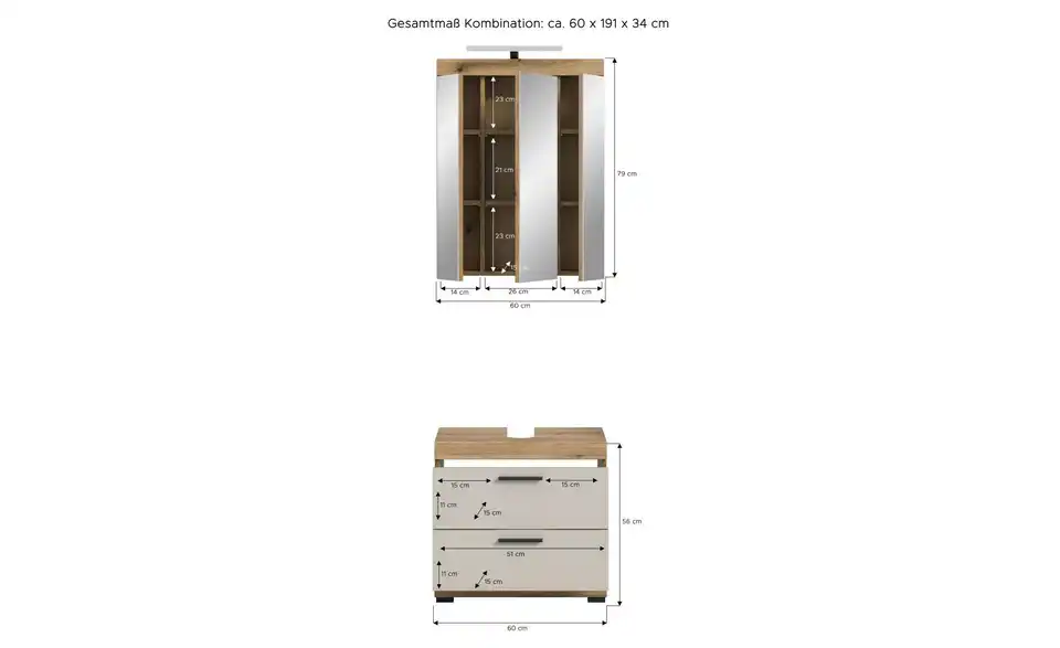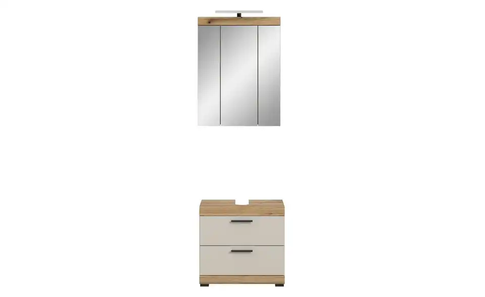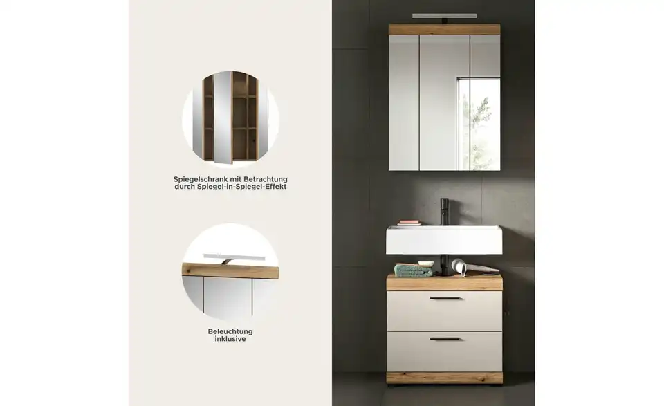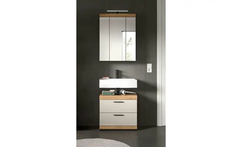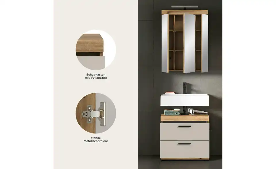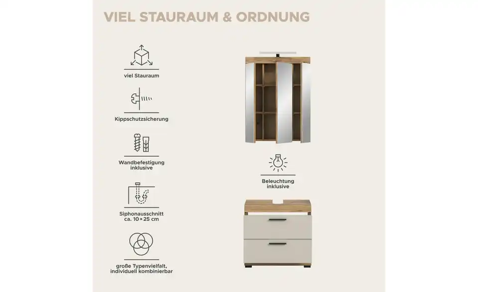 - Bestehend aus1x Waschbeckenunterschrank, 1x Spiegelschrank, 1x Badaufsatzleuchte