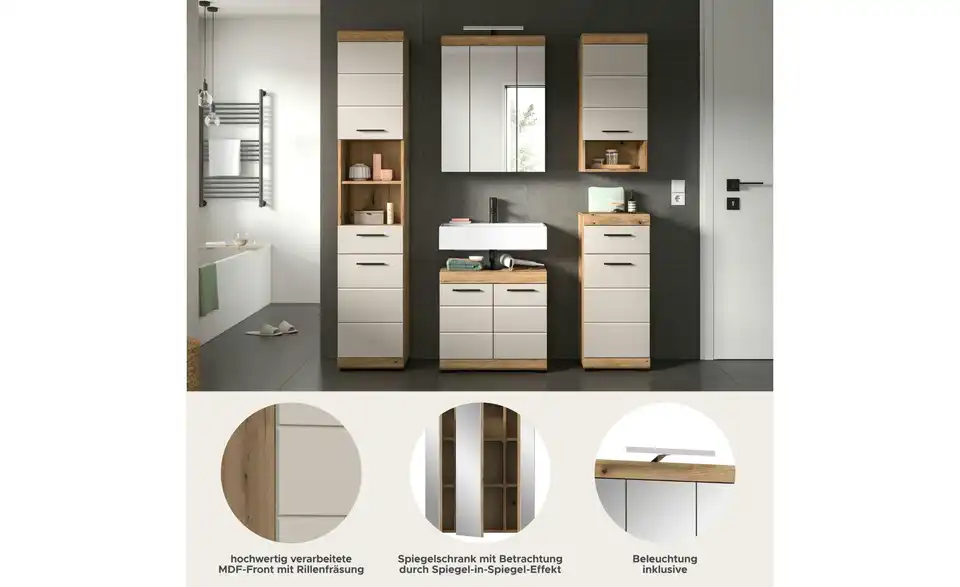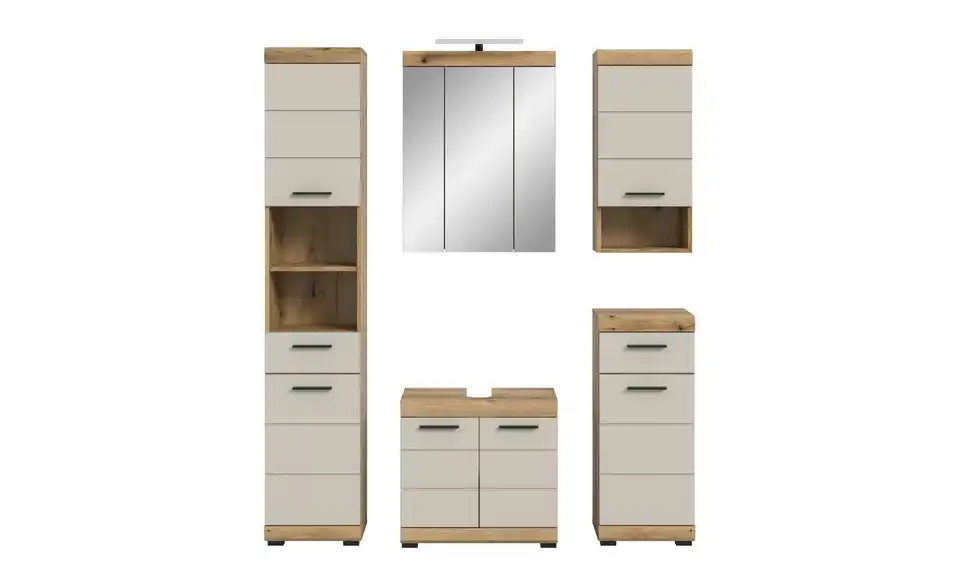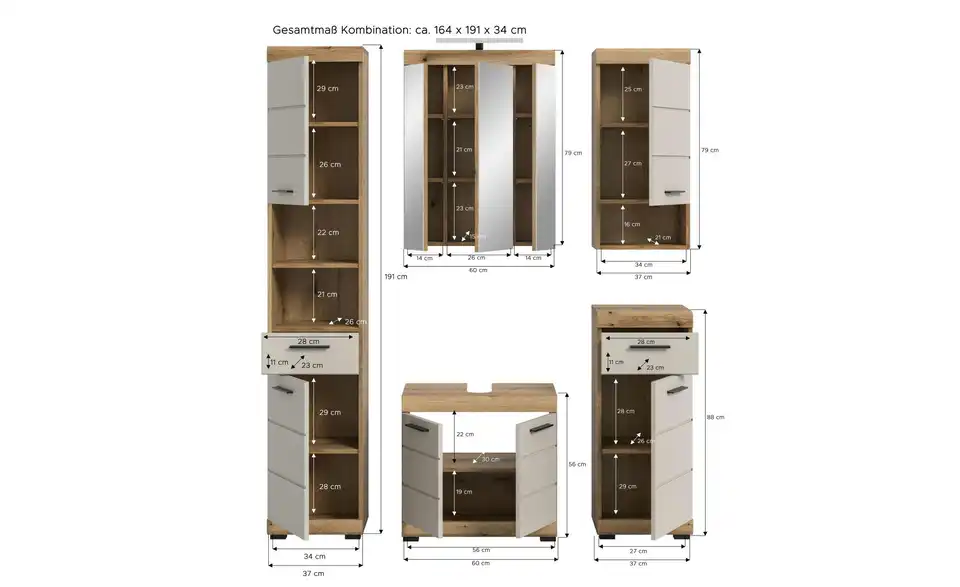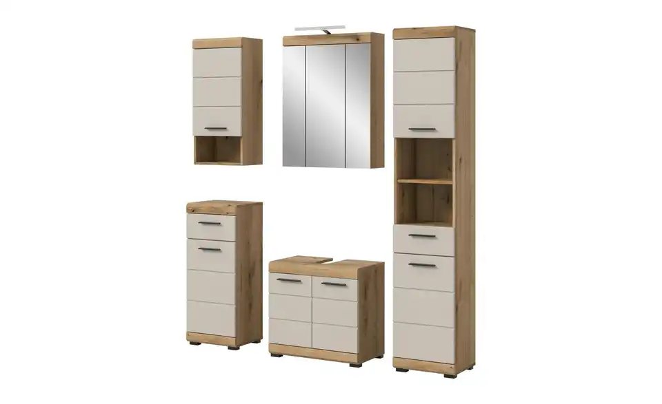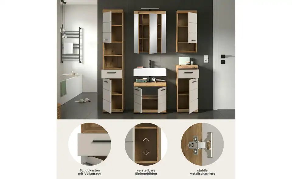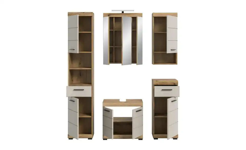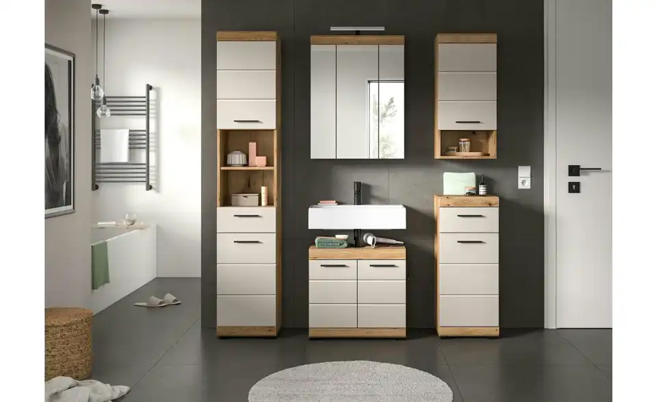 - Bestehend aus1x Hochschrank, 1x Waschbeckenunterschrank, 1x Spiegelschrank, 1x Standschrank, 1x Hängeschrank, 1x Badaufsatzleuchte