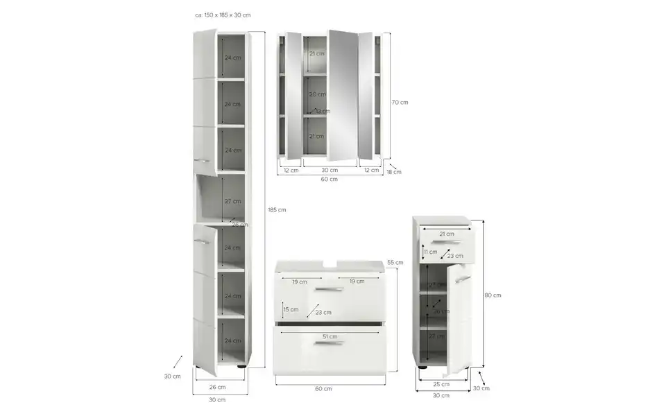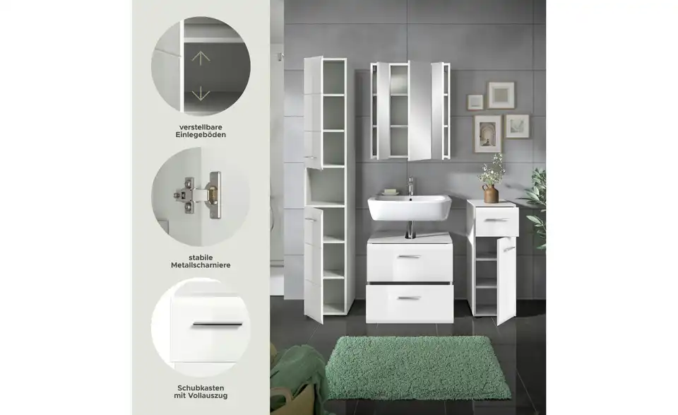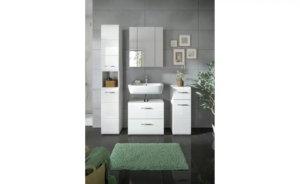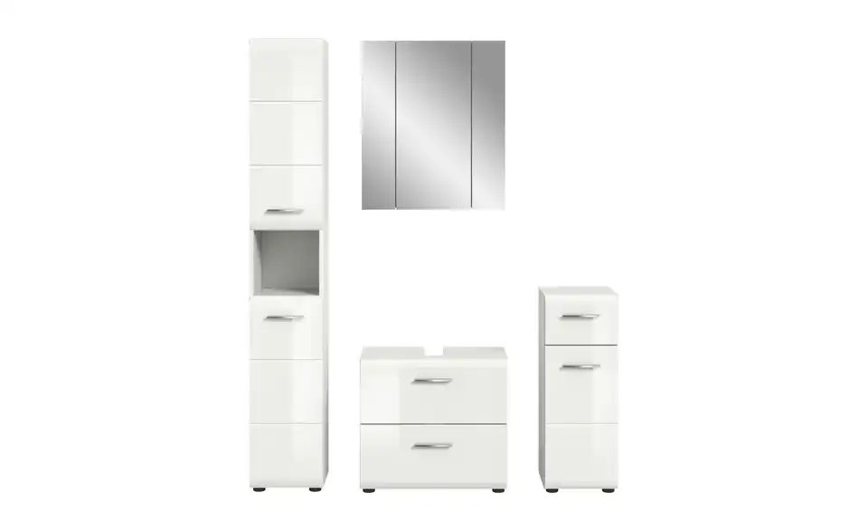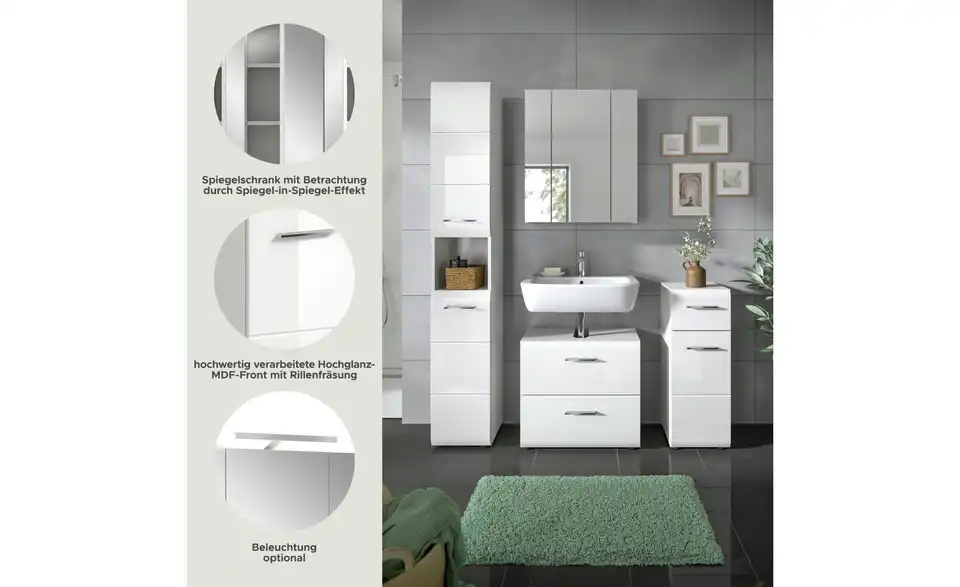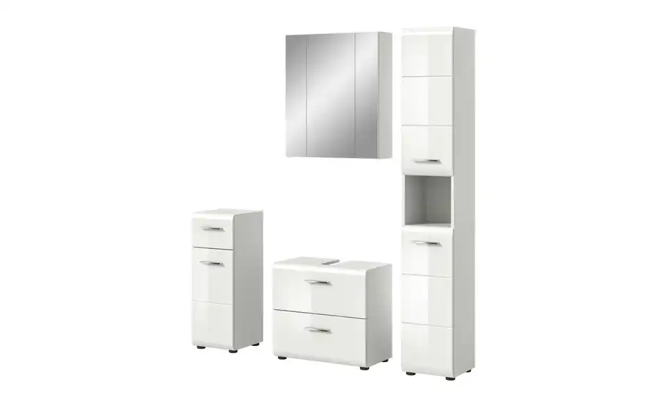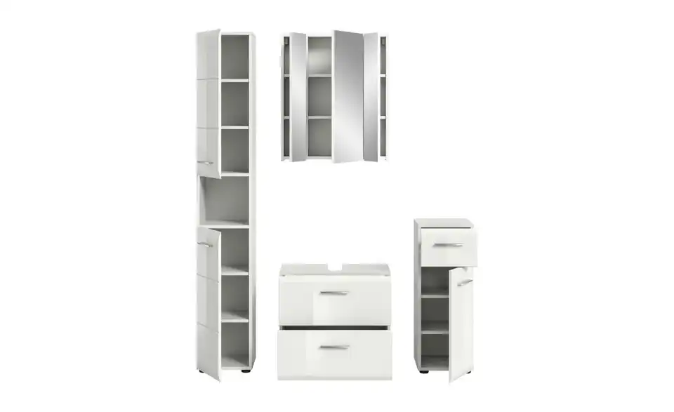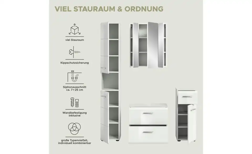 - Bestehend aus1x Hochschrank, 1x WBU, 1x Spiegelschrank, 1x Standschrank hoch