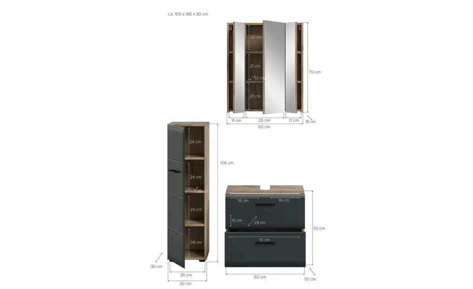 - Bestehend aus1x Stauraumtype, 1x WBU, 1x Spiegelschrank