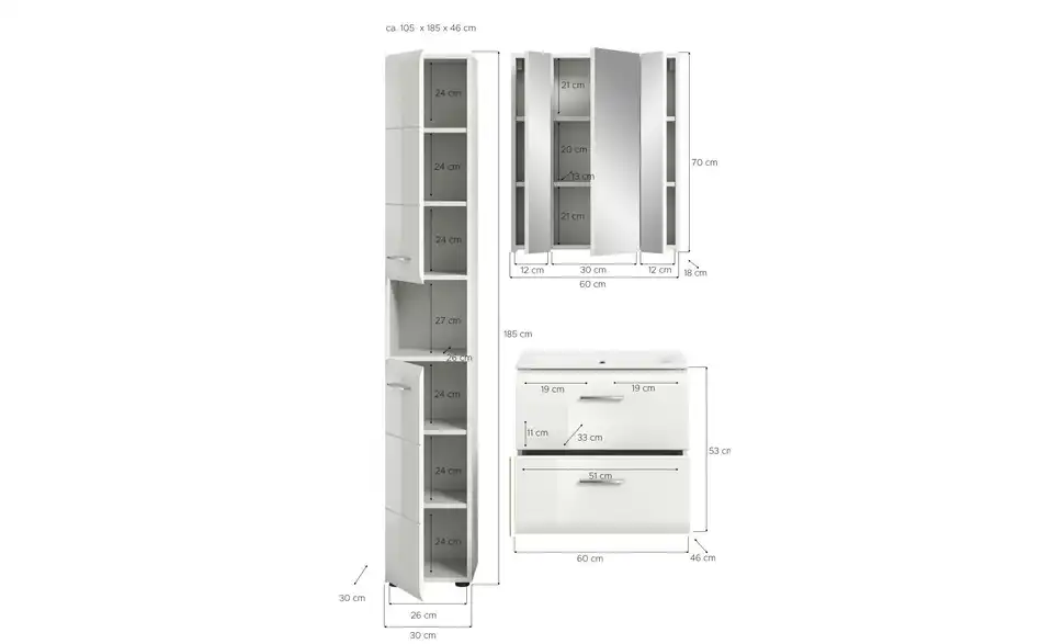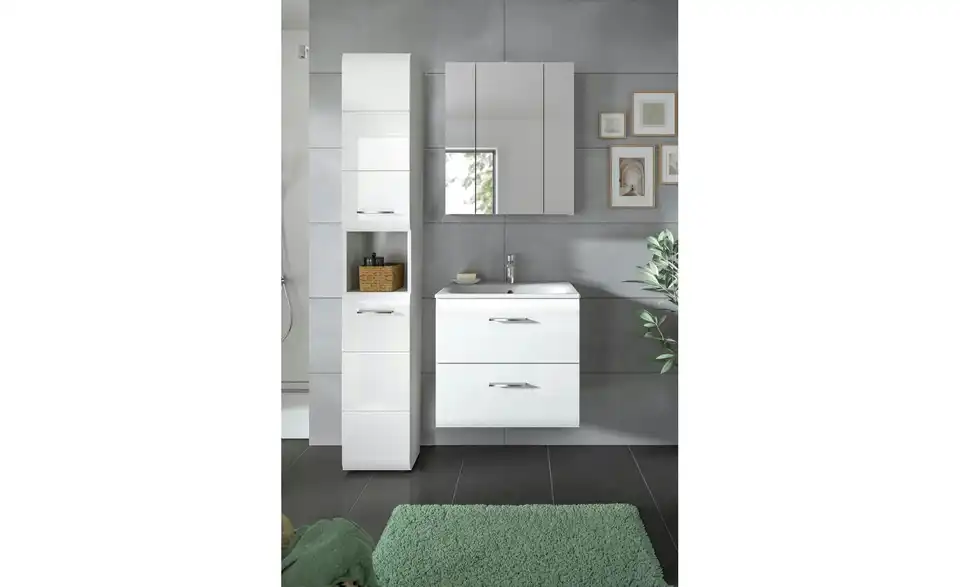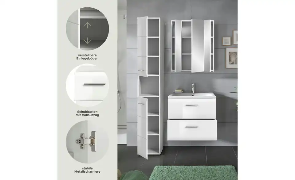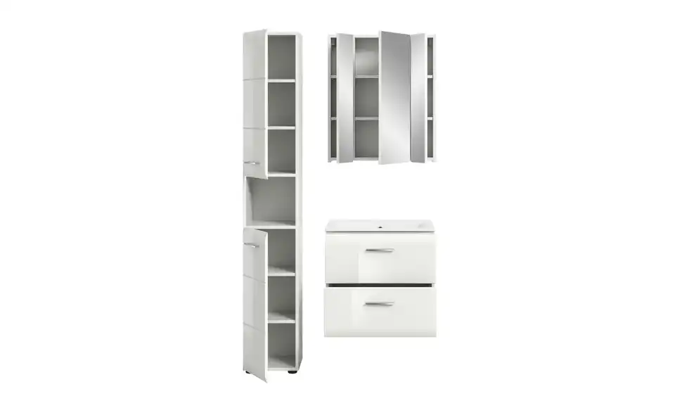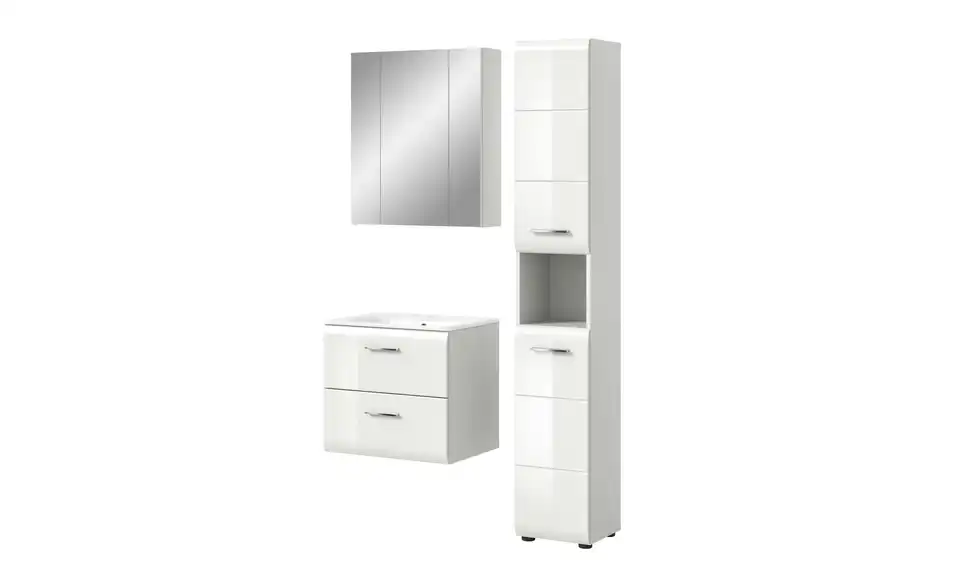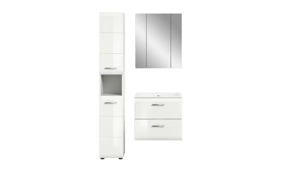 - Bestehend aus1x Hochschrank, 1x Waschtisch inkl. Waschbecken, 1x Spiegelschrank