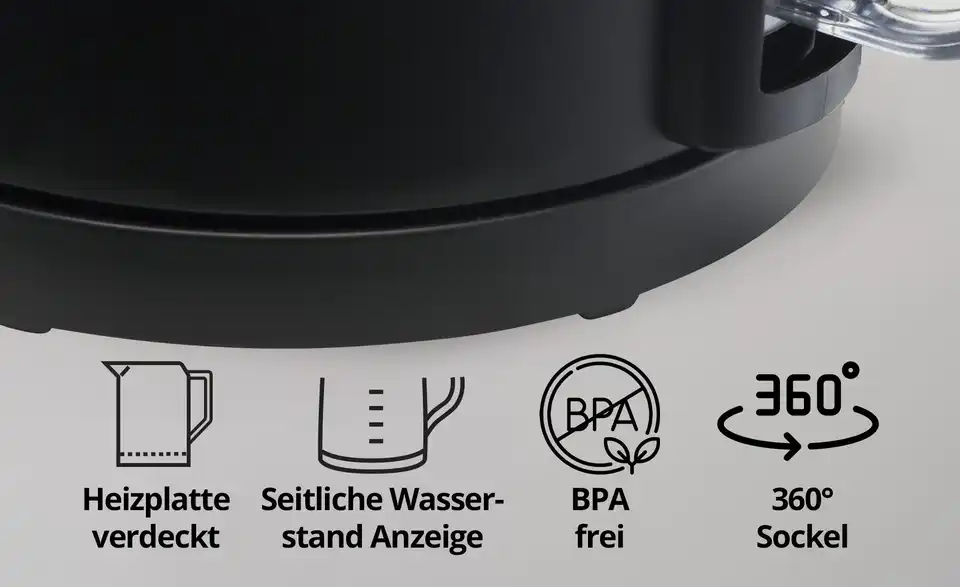 - Ausstattung / FunktionAbschaltautomatikTrockengehschutzkabellosWasserstandsanzeige einseitigVerdecktes Heizelement