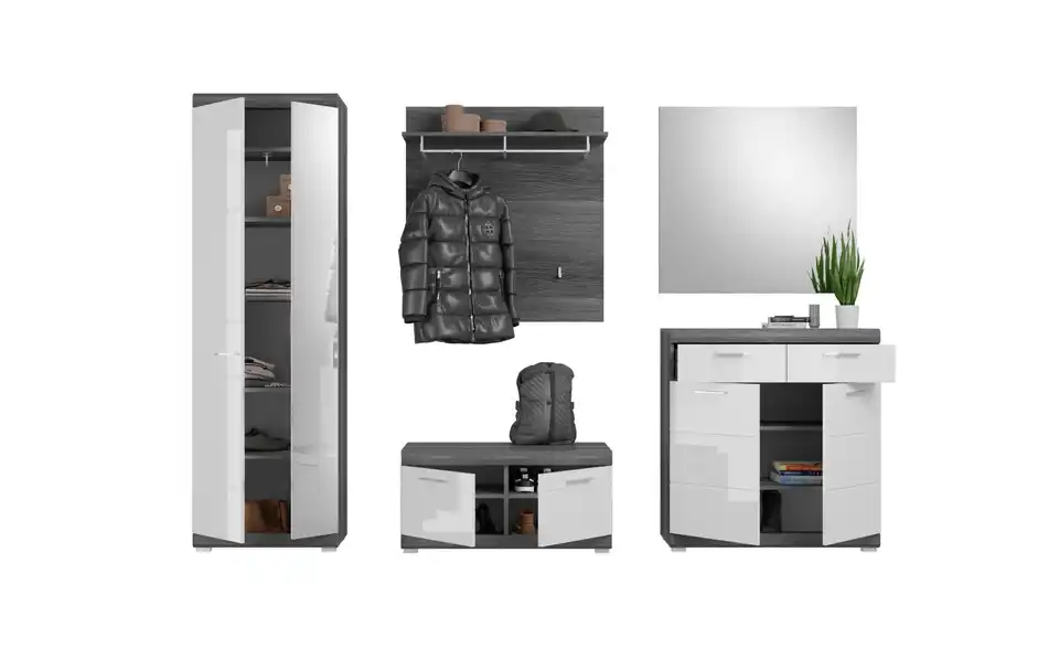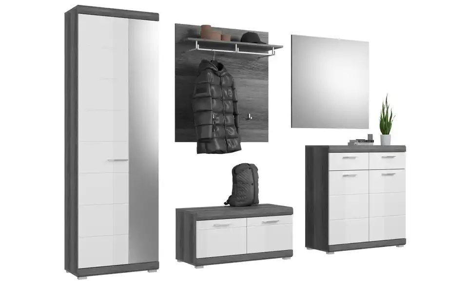 - Lieferumfang / mitgeliefertes ZubehörGarderobenschrank (B/H/T ca. in cm 62/197/37), Sitzbank (B/H/T ca. in cm: 90/44/40), Paneel (B/H/T ca. in cm: 90/98/27), Schuhschrank (B/H/T ca. in cm: 90/96/37), Spiegel (B/H/T ca. in cm: 90/87/2)