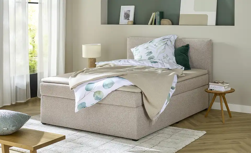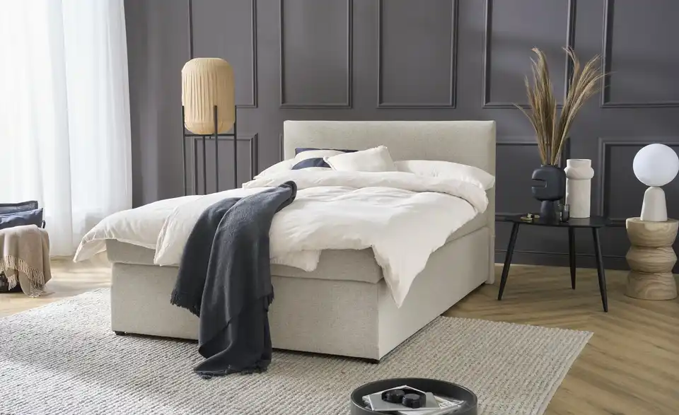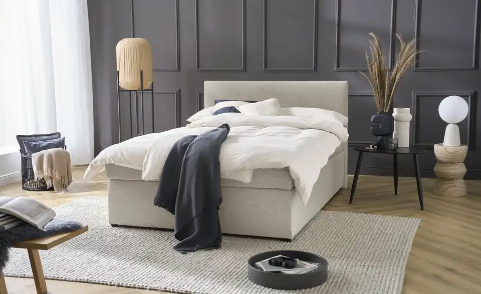Im Boxspringbett Carlo erwarten Sie erholsame Nächte. Das Bett ist mit einem unempfindlichen, Flachgewebe bezogen und lässt sich dadurch gut mit anderen Möbeln kombinieren. Am halbhohen Kopfteil können Sie sich bequem anlehnen. Es ist mit flächenelastischen Bonnellfederkernen ausgestattet. Ein drei Zentimeter dicker Topper mit Schaumstoffkern ist im Lieferumfang enthalten.Lieferung & Versand