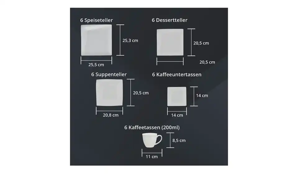 - Lieferumfang / mitgeliefertes Zubehör6x Kaffeetasse6x Kaffeeuntertasse6x Dessertteller6x Speiseteller6x Suppenteller