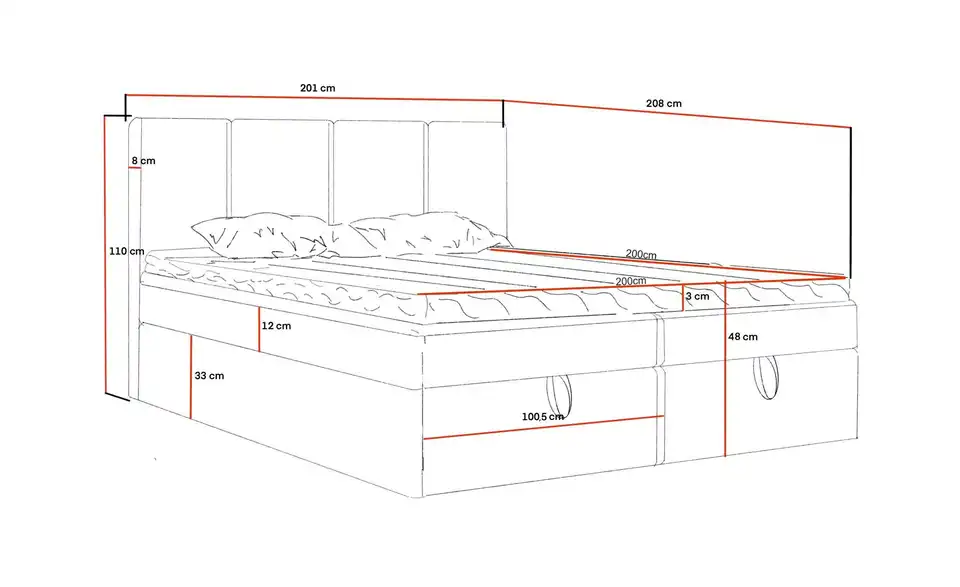 - Lieferumfang / mitgeliefertes ZubehörPolsterbett mit Bettkasten, Kopfteil, Lattenrost und Füße inkl. Anleitung