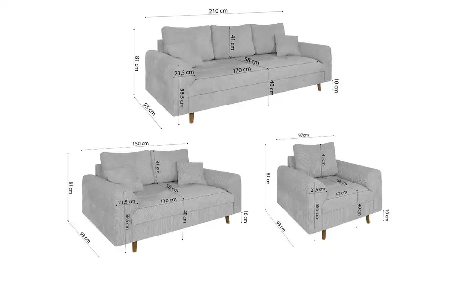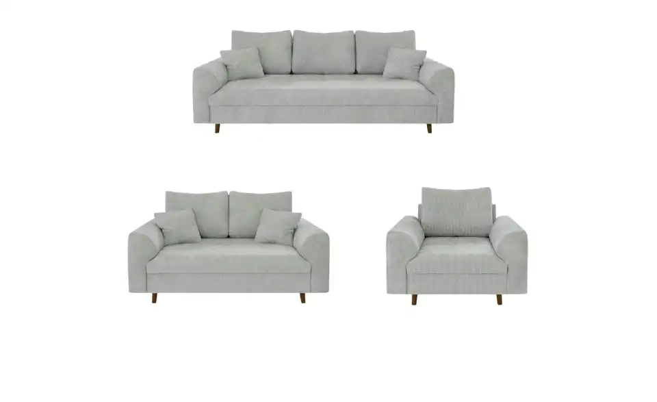 - Lieferumfang / mitgeliefertes Zubehör3-Sitzer Sofa, 2-Sitzer Sofa, Sessel, Montagematerial, 4x Zierkissen