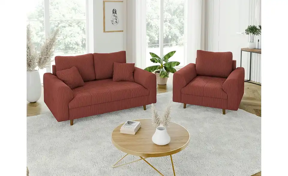 - Lieferumfang / mitgeliefertes Zubehör2-Sitzer Sofa, Sessel, Montagematerial, 2x Zierkissen