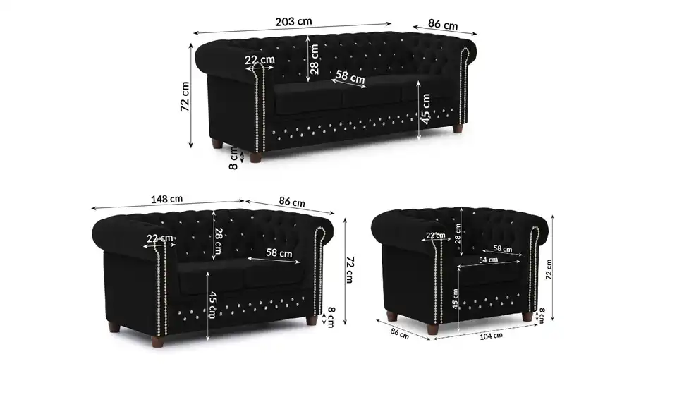 - Mehr zu MaßenSitzbreite - 3-Sitzer 150 cm; 2-Sitzer: 94 cm; Sessel: 54 cm