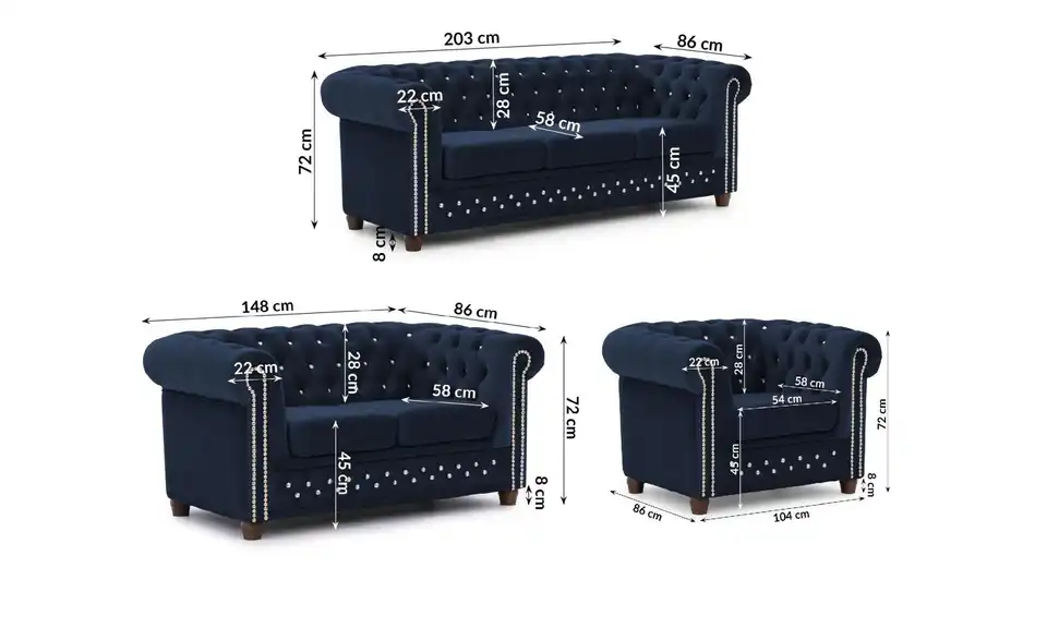 - Mehr zu MaßenSitzbreite - 3-Sitzer 150 cm; 2-Sitzer: 94 cm; Sessel: 54 cm