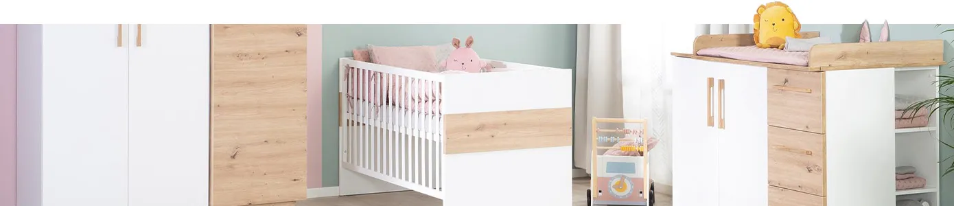 Mit Babybett inkl. Bettseiten, Wickelkommode, Kleiderschrank und Regalen ist das Babyzimmer komplett. Diese und mehr Möbel von verschiedenen Marken finden Sie auch in unseren SCONTO Möbelhäusern. Dort bieten wir auch passende Einrichtung für Kinderzimmer und Jugendzimmer.