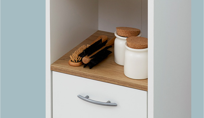 Viel Stauraum, schickes Design und ein fantastischer Preis: Die Serie Sina fürs Badezimmer überzeugt auf ganzer Linie. Die Badmöbel sind matt weiß und werden in Riviera Eiche quer (Nachbildung) abgesetzt. Hinter den Türen und in den offenen Fächern ist viel Platz für Pflegeprodukte, Handtücher und mehr. Dank der beschichteten Oberflächen ist Sina robust und pflegeleicht.