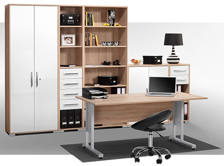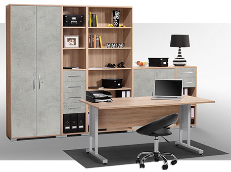 Stellen Sie sich Schränke und Schreibtische nach dem Baukastenprinzip selbst zusammen. Wählen Sie dazu Dekore, Maße und Fronten ganz nach Ihren Wünschen aus.
