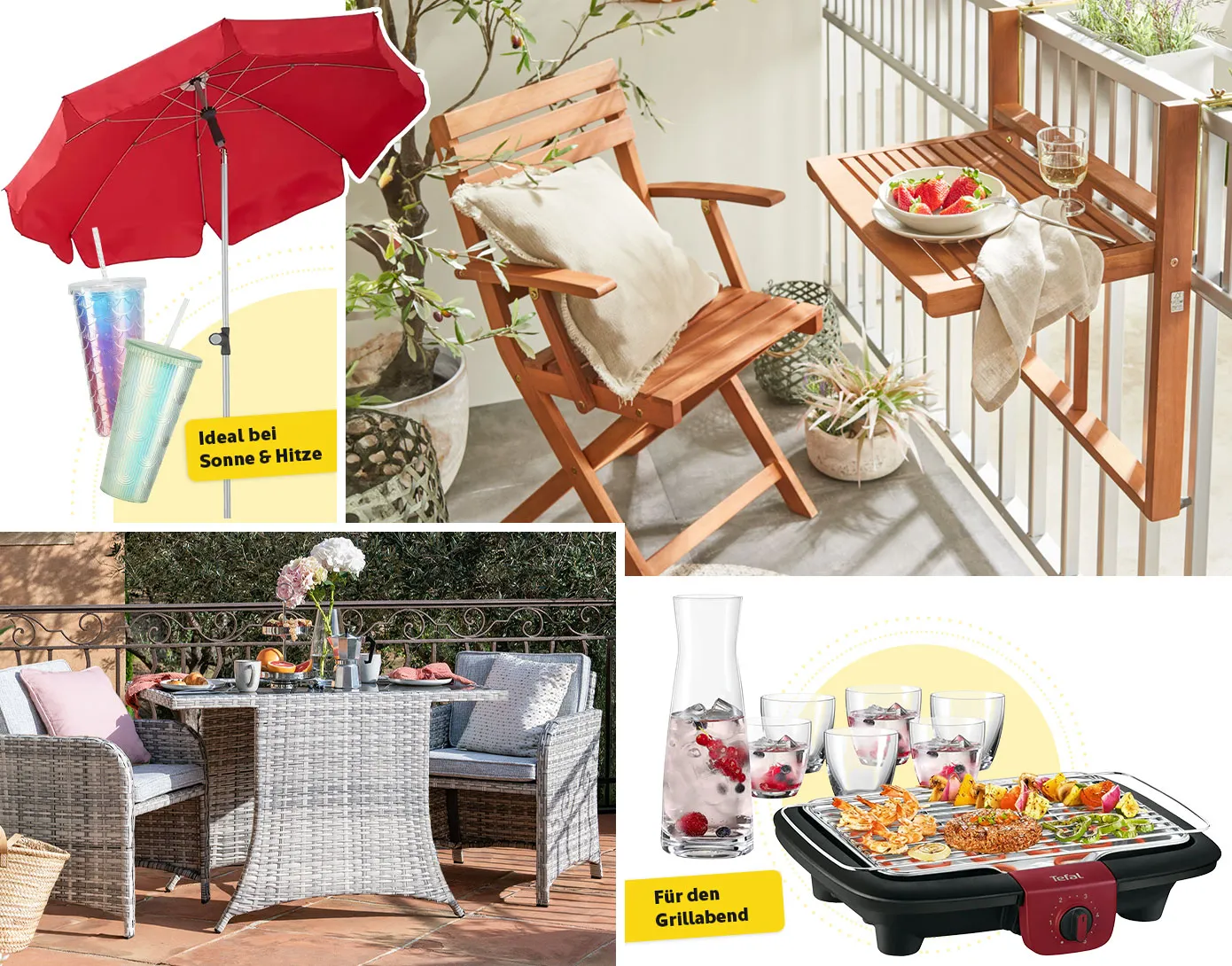 Ob zum Feierabend oder am Wochenende – auf dem Balkon zu Relaxen ist wie ein kleiner Kurzurlaub. Als Basis empfehlen wir Ihnen gemütliche Balkonmöbel mit geringer Stellfläche, so wie unsere schicken Balkonsets. Alternativ bieten wir Ihnen Stapel- oder Klappstühle und klappbare Tische, die sich platzsparend verstauen lassen. In puncto Material eignen sich Akazien- oder Eukalyptusholz sowie Polyrattan und Aluminium. Je nach Lage des Balkons sollten Sie auch auf einen Sonnenschutz nicht verzichten. Hier gibt es vielfältige Sonnenschirme, die sich optional auch an der Balkonbrüstung befestigen lassen. Ein Outdoorteppich, weiche Auflagen und praktischer Elektrogrill machen Ihr Außenwohnzimmer perfekt.